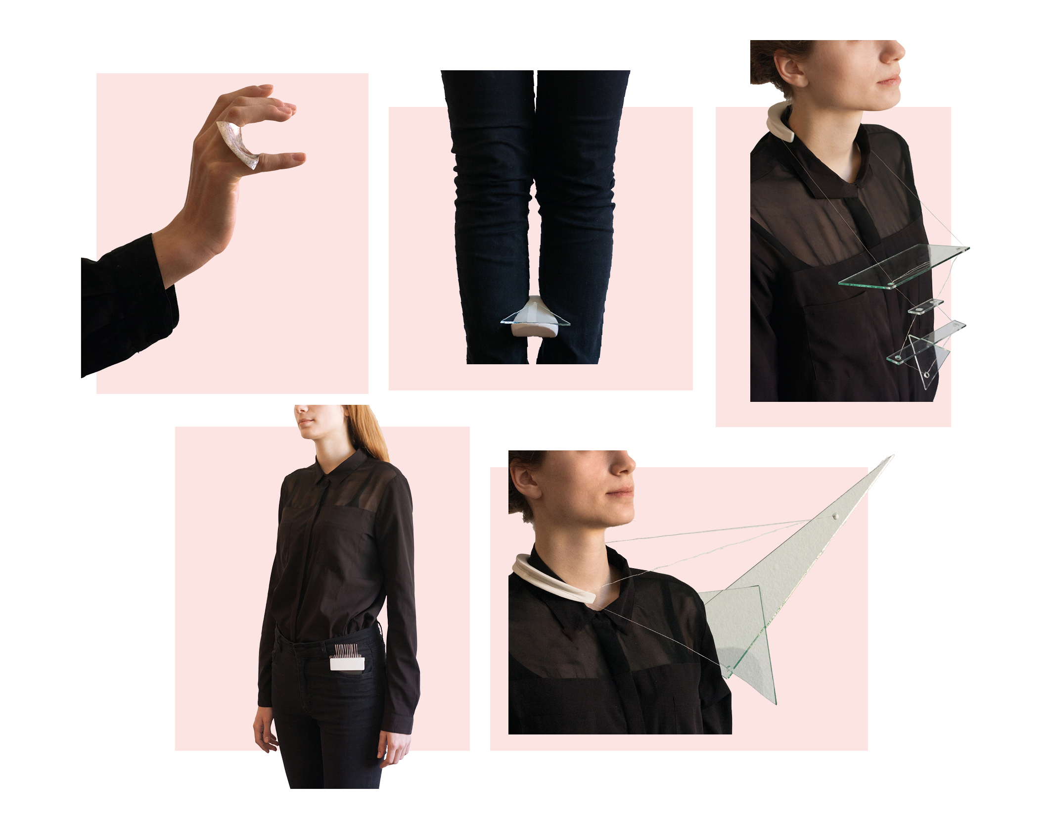 Five stereotypical etiquette formulas are translated into wearable objects. Each object forces the user into a certain pose. If this pose is not obtained, the object falls off, falls apart and eventually breaks or hurts the user. Made from fragile and precious materials, the objects confront the user with the dilemma of choice between respecting the value of an object and individual freedom.