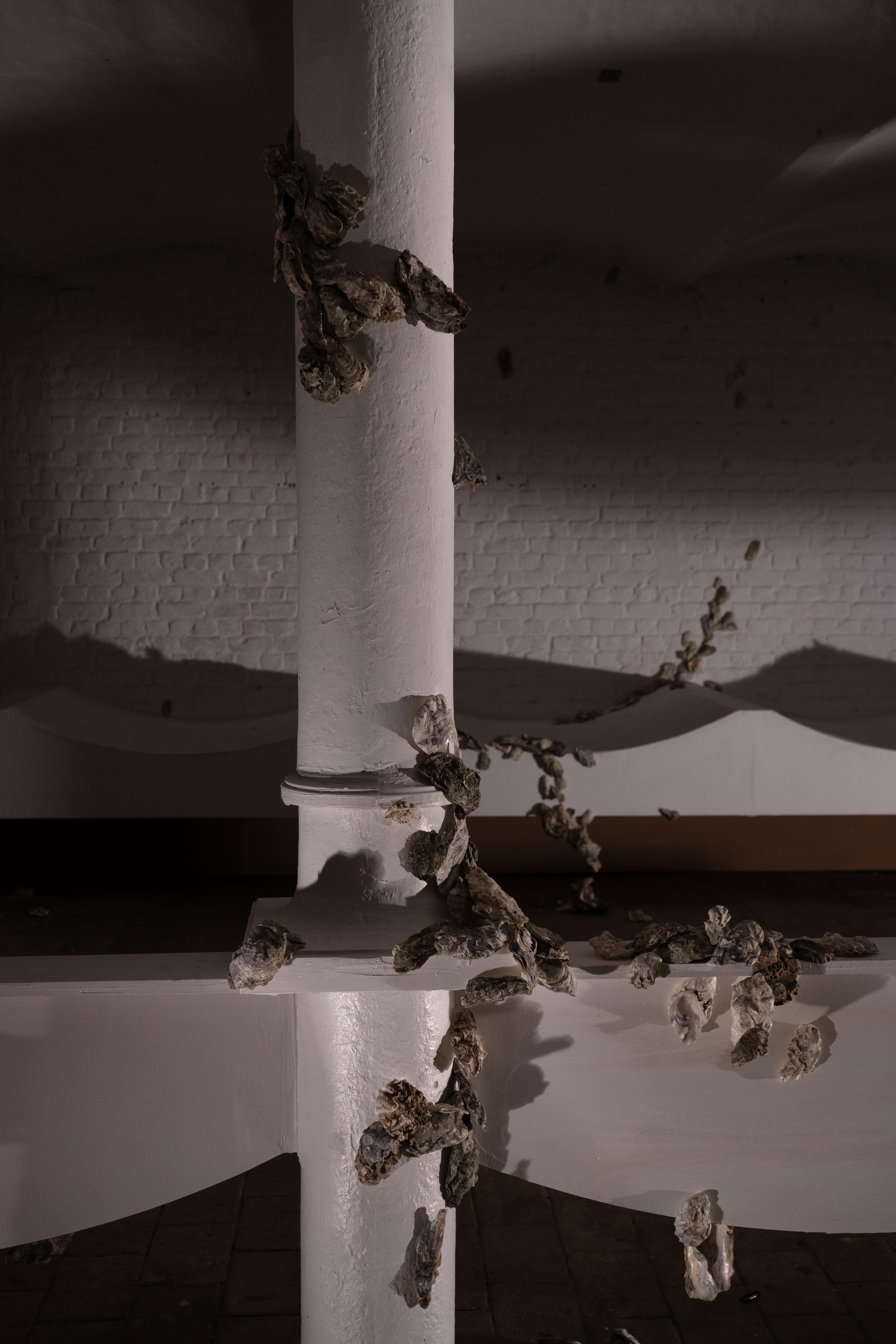 The artistic research highlights the link between ecology and economy based on a phenomenon called Køkkenmødding. This geological formation is the result of a long-term process of managing shellfish waste, and can be seen as a form of unconscious, slow, collective architecture. At the centre, the shell, studied in its biological and symbolic dimensions, becomes the main protagonist of the work. As a luxury product or a staple food, as shell money and as an object of various forms of collections, they embody different ideas of value. This spatial installation with videos refers to Jan van Schaik and Olivia Lennon's intervention in the space of L'Escaut. It revives its symmetry, while at the same time breaking it. The shells occupy the space and confront it with their superficially symmetrical but irregular shapes.